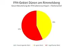 Die Hälfte der FFH-Gebietsfläche ist von FFH-Lebensraumtypen belegt, siehe Diagramm 2. Davon haben 43 % eine gute Gesamtbeurteilung zugesprochen bekommen, der Rest dagegen eine ungenügende Note, siehe Diagramm 3. Da das Gebiet bereits seit Jahrzehnten unter Naturschutz steht und fast vollständig sich im kommunalen Besitz befindet, Siehe Diagramm 4, ist es verwunderlich, dass keine der LRT-Flächen als hervorragend beurteilt wird. Dies wird verständlich, wenn man die Kriterien für eine hervorragende Beurteilung betrachtet. Bei acht Lebensraumtypen als Erhaltungsziel wird es nahezu unmöglich, bei einem so kleinen Gebiet ohne Vorhandensein zusätzlicher Entwicklungsflächen die geforderten vier Entwicklungsstadien (Pionier-, Aufbau-, Reife- und Degenerationsphase) darzustellen.[20] Laut Managementplan ist aber an eine Ausweitung des FFH-Gebietes nicht gedacht.