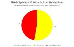 Nur ein Viertel des FFH-Gebietes ist mit FFH-Lebensraumtypen ausgewiesen. Im Bereich von vier bis fünf Prozent liegen die FFH-Lebensraumtypen 6510 Magere Flachland-Mähwiesen, 2320 Sandheiden mit Krähenbeere auf Binnendünen, 7140 Übergangs- und Schwingrasenmoore und 4030 Trockene Heiden. Alle anderen liegen weit darunter, siehe Diagramm 4. Knapp zwei Drittel der mit FFH-Lebensraumtypen ausgewiesenen Fläche des FFH-Gebietes hat eine gute Gesamtbeurteilung zugesprochen bekommen. Ein Drittel hat nur den weniger guten Benotungsgrad C erhalten. Knapp vier Prozent erreichen sogar eine hervorragende A-Bewertung, siehe Diagramm 5. Hier handelt es sich ausschließlich um den im FFH-Gebiet am zweithäufigsten vorkommenden Gesamtbestand des FFH-Lebensraumtyps 2320 Sandheiden mit Krähenbeere auf Binnendünen.