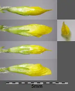 Die zwittrigen Blüten sind zygomorph und fünfzählig mit doppelter Blütenhülle. Die fünf 1,5 bis 2 Millimeter langen Kelchblätter sind glockig verwachsen. Der fünfnervige und kahle Kelch endet in fünf Kelchzähnen. Die unteren Kelchzähne sind fast doppelt so lang wie die Kelchröhre, die oberen kürzer als dieser. Von den fünf gelben Kronblättern sind einige verwachsen. Während der Fruchtreife verfärben sie sich nach braun. Die Blütenkrone ist etwa 4 Millimeter hoch und besitzt die typische Form der Schmetterlingsblüte. Die Kronblätter sind eiförmig, glatt und längsgefaltet mit einem trichterförmigen Rippenbündel in jeder Hälfte. Ihr Rand ist ganz oder teilweise gezähnelt. Die Flügel sind genagelt und kürzer als bei anderen Arten der Gattung Trifolium. Von den zehn Staubblättern sind neun verwachsen und eines frei. Der oberständige Fruchtknoten ist lang gestielt und länger als der Griffel.