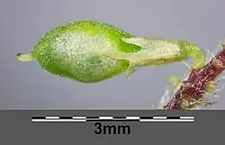Die einsamige Hülsenfrucht ist 2 bis 3 Millimeter lang und 1,5 Millimeter breit. Der Griffel bleibt auch bei der Fruchtreife erhalten und füllt ein Viertel bis ein Drittel der Frucht aus. Die hellbraunen Samen sind bei einer Länge etwa 1,3 Millimetern ellipsoid. Der Samen ist sehr leicht, etwa 2.000.000 Samen wiegen ein Kilogramm.[2]