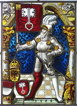 - ↑ Der Begriff «heilig Rych» wird für das älteste erhaltene Zwickelbild von Schwyz verwendet, das nachweislich in den Burgunderkriegen 1474–1477 getragen wurde. Es handelt sich um ein bemaltes Lederstück, dass schematisch ein Kreuz, flankiert von zwei senkrechten Strichen, zeigt. Gemeinhin wurde dies als Darstellung der Arma Christi (d. h. Lanze und Schwamm) gedeutet. Hier wird dasselbe Symbol in den Einschnitten der Schlüsselbärte nun, in Anlehnung an das Nidwaldner Zwickelbild, als Andeutung der Gestalten von Maria und Johannes unter dem Kreuz interpretiert.