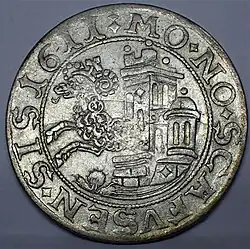 - In Gold ein schwarzer, springender goldgekrönter und goldbewehrter Widder mit roter ausgeschlagener Zunge.