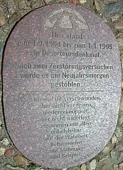 - ↑ Marco Dräger: Deserteur-Denkmäler in der Geschichtskultur der Bundesrepublik Deutschland. Peter Lang, Frankfurt am Main 2017, ISBN 978-3-631-71971-8.