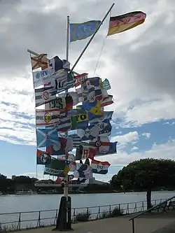 Auch die Reihenfolge der Masten für einzelne Flaggen kann durch Verordnungen vorgegeben sein. Dabei unterscheidet man zum Beispiel Flaggen internationaler und überstaatlicher Organisationen, wie der Europäischen Union oder NATO, die eigene Nationalflagge, weitere Nationalflaggen und subnationale Flaggen. Als ein besonders ehrenvoller Platz gilt entweder die Mitte oder die (aus Sicht des Betrachters) erste Position von links.[1] Vor dem Hauptquartier der Vereinten Nationen in New York werden die Flaggen der Mitgliedsländer an Masten in alphabetischer Reihenfolge (auf gleicher Höhe) gesetzt.