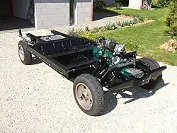 - Leiterrahmen: zwei mit Querholmen verbundene Längsträger aus offenen Profilen (bis in die 1950er Jahre weit verbreitet, heute typisch für Lastwagen). Der Leiterrahmen hat den Vorteil, dass mit geringem Aufwand die Gesamtfahrzeuglänge, der Radstand und der hintere Überhang variiert werden können. Anbauteile wie Tanks können an verschiedenen Stellen des Rahmens befestigt werden.[1]