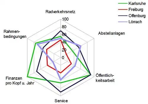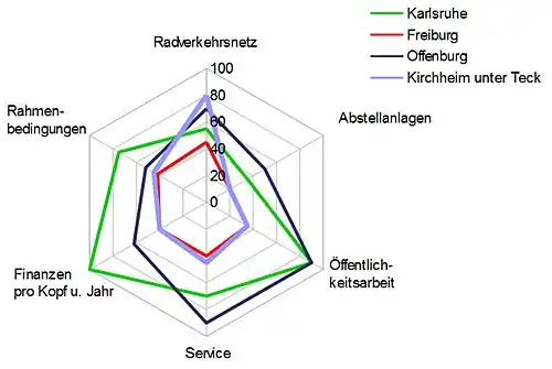 In Karlsruhe wurde im Jahr 2012 ein Radverkehrsanteil von 25 % überschritten. Für 2020 wird ein Anteil von 30 % angestrebt.[21]
