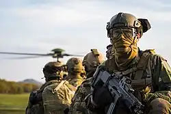 In der British Army gibt es keine Fallschirmjägertruppe als selbständige Truppengattung. Alle Fallschirmjäger sind Angehörige des Parachute Regiment, einen im Zweiten Weltkrieg gegründeten Infanterieregiment und heute der einzige fallschirmsprungfähige Infanterieverband im britischen Heer. Er ist in drei aktive und ein Reservebataillon gegliedert.[17] Zwei Bataillone stellen einen Teil der Infanteriekräfte der 16 Air Assault Brigade,[18] ein weiteres Bataillon unterstützt die Spezialkräfte.