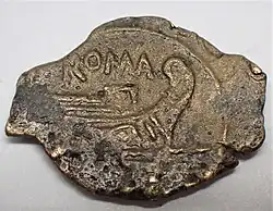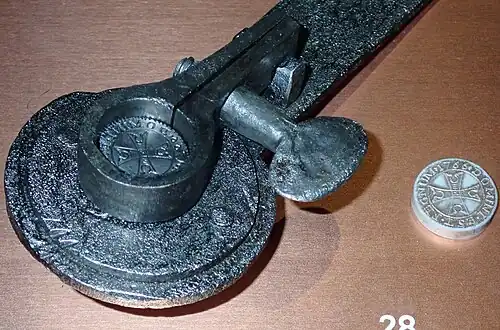Die Geschichte des Falschgelds ist fast so alt wie die des Geldes selbst.[4] Erstmals zu Zeiten Solons (640–560 v. Chr.) wurde Falschmünzern die Todesstrafe angedroht. Im Römischen Reich wurde von Kaiser Konstantin gesetzlich verfügt, dass der Münzfälscher, neben der Einziehung seines gesamten Vermögens, mit dem Feuertod zu bestrafen ist.[5] Im Jahr 271 n. Chr. führten die Münzfälschungen des kaiserlichen Finanzministers Felicissimus zu einer blutigen Revolte in Rom. Um 220 n. Chr. wurden in Rißtissen, heute ein Stadtteil von Ehingen in Baden-Württemberg, das damals zur römischen Provinz Rätien gehörte, falsche römische Denare mit Hilfe von Tongussformen in großem Stil hergestellt; Falschmünzen und Gussformen können im Rißtisser Römermuseum besichtigt werden.