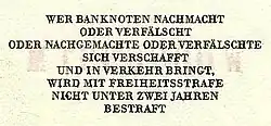 Auf dem 50- und dem 100-DM-Schein der zweiten Serie wurden potenzielle Geldfälscher durch einen kleingedruckten Hinweis gewarnt: „Wer Banknoten nachmacht oder verfälscht, oder nachgemachte oder verfälschte sich verschafft und in Verkehr bringt, wird mit Zuchthaus nicht unter zwei Jahren bestraft“. Das Wort Zuchthaus wurde 1970 durch Freiheitsstrafe ersetzt. Dieser Straftext ist ebenfalls auf der Rückseite aller Scheine der dritten Serie („BBk I“) vorhanden. Das Zitat des Paragraphen 146 für Geldfälschung aus dem StGB sollte der Prävention dienen und hat rechtlich keine Bedeutung, sodass es bei der vierten Serie („BBk III“) ersatzlos entfallen ist.[34] Ähnlich war es auch bei der DDR-Mark formuliert.