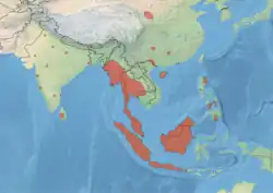 Faltlippen-Bulldoggfledermäuse kommen in Indien, Sri Lanka, China, Vietnam, Thailand, Laos und Kambodscha, sowie auf Borneo, Java, Bali und Lombok vor. Auch die Philippinen gehören zum Verbreitungsgebiet der Art. Vorkommen auf der Malaiischen Halbinsel und Sumatra sind entweder erloschen oder die Art wurde falsch bestimmt. Vermutlich kommt die Faltlippen-Bulldoggfledermaus auch in Bangladesch vor.[2] Auf Grund der Größe des Verbreitungsgebiets, der Größe der Population sowie dem Vorkommen in geschützten Habitaten werden Faltlippen-Bulldoggfledermäuse seitens der IUCN als „nicht gefährdet“ („least concern“) eingestuft.[4]