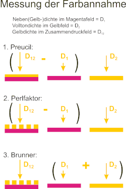 Die Literatur gibt drei Varianten zur Berechnung der Farbannahme aus densitometrischen Daten: