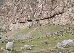 Gleich neben dem Hang befinden sich mehrere hundert Steinquader.[1] Sie wurden zwar von frühen europäischen Reisenden aufgezeichnet, aber nicht als aus der sassanidischen Zeit stammend identifiziert, bis es Heinz Luschey gelang, sie zu untersuchen. Luschey kam zu dem Schluss, dass diese Steine aus demselben Fels wie der Farhād Tarāsch waren.[1]