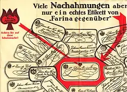 Die Echtheit der Ware wurde durch ein mit dem Familienwappen versehenes rotes Siegel bezeugt. Darüber hinaus war jeder Lieferung eine gedruckte Gebrauchsanweisung in Form eines vom Inhaber eigenhändig unterschriebenen Zettels beigefügt. Laut dieser Gebrauchsanweisung diente das Wasser nicht allein zur äußerlichen Anwendung, sondern leistete auch bei der Pflege der Zähne, der Beseitigung von Mundgeruch und der Bekämpfung ansteckender Krankheiten beste Dienste. Als eine Madame Duplessis aus Nogent im August 1785 in Köln anfragen ließ, ob die Lähmung ihres Gatten auch durch Eau de Cologne zu heilen sei, antwortete Johann Maria Farina (III), sie solle Leinen in das Wasser tauchen und die schmerzenden Stellen damit einreiben. Auch könne sie wöchentlich dreimal 50 Tropfen in das Brunnenwasser geben. „Zumindest“, so schließt das Schreiben, „riskieren Sie nicht, ihm damit irgendwie zu schaden.“[19] Erst im Jahr 1811 verschwand der Hinweis auf die medizinischen Wirkungen des Produktes vom Gebrauchszettel. Als Reklamemittel blieben die Zettel aber erhalten. Die eigenhändige Unterschrift des Inhabers wurde 1803 durch einen mittels Stempel aufgebrachten Namenszug ersetzt, was es ermöglichte, jeder einzelnen Flasche einen Zettel beizugeben.