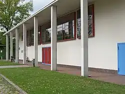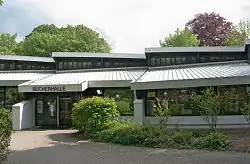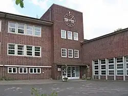 Hinter der Volkshochschule liegt die Sporthalle und Aula für die Farmsener Volksschule von Karl Schneider (1928), die als ein Beispiel der Vorkriegsmoderne gilt.[10]