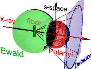 Die Geometrie der Faserbeugung zeigt die Abbildung. Sie basiert auf der von Polanyi vorgeschlagenen Darstellung. Die Bezugsrichtung ist der Primärstrahl (Aufschrift: X-ray). Wird die Faser aus der Senkrechte um den Winkel β gekippt, dann kippt auch die Information über ihre Struktur im reziproken Raum (s-Raum). Im s-Raum ist die Ewaldkugel eine Kugel, deren Mittelpunkt in der Probe liegt. Ihr Radius ist 1/λ, wobei λ die Wellenlänge der einfallenden Strahlung ist. Auf der Oberfläche der Ewaldkugel liegen all die Punkte des reziproken Raums, die vom planaren Detektor gesehen werden. Sie werden durch Zentralprojektion auf die Pixel des Detektors abgebildet.