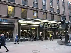 Ab den 1990er Jahren kamen Niederlassungen, Zusammenschlüsse und die Übernahme anderer Unternehmen, u. a. in Polen, Russland und Großbritannien, hinzu, außerdem eine Café-Kette.[6] Vor dem Café in Helsinki steht seit 1991 zudem eine von Fazer an die Stadt Helsinki gespendete Skulptur namens Fazerin kukko.[7]