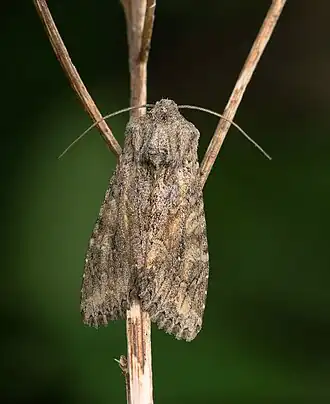 Die Flügelspannweite der Falter beträgt 33 bis 46 Millimeter.[2] Die Grundfarbe der Vorderflügeloberseite variiert von hell beigegrau bis hin zu dunkel braungrau. Eine schwarze Wurzelstrieme fehlt. Nieren- und Ringmakel heben sich schwach hell ab, Querlinien sind einfach oder doppelt ausgeführt und stark gezackt. Der Bereich zwischen Saum und Wellenlinie ist leicht verdunkelt. Die gesamte Zeichnung ist meist undeutlich und verwaschen. In Küstengebieten kommt eine weißgraue, als f. engelharti bezeichnete Farbvariante vor. Die Hinterflügeloberseite ist einfarbig hell graubraun, Richtung Saum etwas dunkler.
