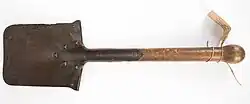 Mit der Verfügung vom 26. Januar 1938 (HV 38C, Nr. 82) wurde aus Einsparungsgründen die Verwendung von Kunstleder für die Spatentaschen angeordnet. Für die Trageschlaufen und den Befestigungsriemen war weiterhin Leder vorgesehen. Die Verfügung vom 12. November 1938 (HV 38C, Nr. 1038) gab die Einführung eines zusammenklappbaren Schanzzeugs, des Klappspatens, bekannt.[8] Dieser sollte in der Folgezeit den bisherigen Feldspaten ersetzen. Ziel war es, einen komfortableren Feldspaten einsetzen zu können, da der Klappspaten unter anderem mit einem längeren Holzstiel ausgestattet werden konnte, ohne die Verstaulänge zu erhöhen. Der Klappspaten, der ein spitzes Blatt besaß, hatte ausgeklappt eine Länge von rund 70, eingeklappt 50 cm.[9] Dieses Blatt konnte mittels einer aus Bakelit gefertigten Überwurfmutter in drei Stellungen fixieren werden.[8] Neben der senkrechten Haltung war nun eine Positionierung in Stielrichtung und im 90-Grad-Winkel zum aus Holz gefertigten Stiel möglich. Dadurch konnte der Spaten auch als Hacke eingesetzt werden. Der deutsche Klappspaten wurde gattungsprägend und gilt als Urvater dieses Spatenmodells. Die Funktionsweise wurde weltweit kopiert. Neben dem Klappspaten blieb in Deutschland jedoch das ältere, „stehende“ Modell während des Zweiten Weltkriegs wesentlich verbreiteter. Der Vorteil gegenüber dem Klappspaten war dessen einfachere, schnellere und damit auch günstigere Herstellungsweise, was insbesondere während des weiteren Kriegsverlaufs der Verknappung vieler Güter entgegentrat. Das schwarz lackierte Metall des eigentlichen Spatenblatts wurde sowohl beim älteren Modell, als auch beim Klappspaten in ein Leder- beziehungsweise Kunstlederfutteral geschoben. Beim Klappspaten war die Tragetasche unten spitz und oben eckig ausgeführt und bestand aus schwarzem oder feldgrauem Leder beziehungsweise Kunstleder. Während des Krieges bestand die Hülle der meisten Klappspaten aus olivfarbenem Segeltuch mit Schlaufen aus Webgurten. Im Gegensatz zum bisherigen Feldspaten wurde das Spatenblatt des Klappmodells von oben in das Futteral geschoben. Von Außen wurde die Konstruktion von einem Querriemen gehalten, Die obere Öffnung sicherte ein aufgeknöpfter senkrechter Riemen. Eine breite Trageschlaufe war an der dem Körper zugewandten Seite aufgenäht oder aufgenietet.[9] Diese Schutzhülle wurde aus Einsparungsgründen im Laufe des Krieges durch geschwärzte Exemplare aus Pressstoff, einem Ersatzmaterial aus speziell geschichtetem und behandeltem Papierzellstoff, ersetzt. Die als Rahmen gefertigten Spatenhüllen besaßen ursprünglich an der Vorder- und Rückseite in der Mitte eine rechteckige Aussparung durch die der Spaten selbst sichtbar wurde. Mittels der Trageschlaufen an den Futteralen wurden beide Spatenmodell auf das Koppel aufgeschoben und hinter der linken Hüfte getragen. Dabei konnten die Hüllen je nach Hersteller eine oder zwei Befestigungsschlaufen besitzen. Bei Ausführungen mit zwei Schlaufen wurde die Tasche für das Seitengewehr dazwischen mit aufgeschoben, bei Modellen mit einer Schlaufe kam die Seitengewehrtasche darüber. Der außen schräg aufgesetzte Schnallriemen der Spatentasche war extra lang ausgeführt, um gleichzeitig das Seitengewehr zu fixieren. Neben diesen bekanntesten Formen des damaligen Schanzzeugs sind auch weiterhin stehende Spaten mit spitzem Blatt in Verwendung gewesen. Weitere von der Norm abweichende Spaten und Taschen wurden während des Dritten Reichs teilweise auch von nichtmilitärischen Organisationen getragen und im Zuge der immer schwieriger werdenden Versorgungslage auch beim Militär eingesetzt. Daher fanden sich dort auch Spatentaschen, deren rückseitiger Rahmen durchgehend aus Leder besteht oder Taschen aus Segeltuch mit Webgurtschlaufen.[8]