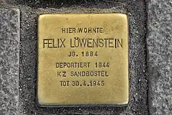 - Vor dem Haus Neumarkt 4 in Osnabrück, dem letzten freiwilligen Wohnort von Felix Löwenstein, erinnert ein Stolperstein an Felix Löwenstein.[2]