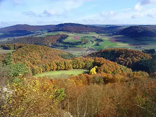 ![]() Von der Hochfläche des Meißnervorlands bietet sich ein Blick auf die Schutzgebiete der Gobert. | ||