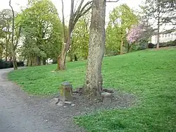 Im Januar 1903 bemühte sich Albert Heuser, Vorstandsmitglied des Verschönerungsvereins, um eine schützende und künstlerisch gestaltete Umzäunung. Sein Anliegen wurde zunächst mehrmals vertagt, da man der Meinung war, eine einfache Kupferplatte mit Inschrift genüge. Anfang des Jahres 1908 hatte Heuser zusammen mit dem Direktor der Kunstgewerbeschule Werdelmann ein Preisausschreiben initiiert. Der erste Preis ging an den Bildhauer Wilhelm Giesecke mit seinem Entwurf Stein und Eisen. Der zweite und dritte Preis gingen an den Architekten Peter Klotzbach mit seinen Entwürfen Unterordnung und Laues Leben. Der Entwurf Gieseckes kam zur Ausführung, wobei Heuser die Kosten übernahm. Der Baum hatte damals eine Höhe von 9,85 Metern und einen Stammumfang von 49 Zentimetern.