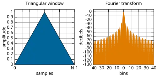 Das Dreieckfunktion-Fenster kann als eine Faltung zweier Rechteckfenster aufgefasst werden, die Hauptkeule ist doppelt so breit wie bei dem Rechteckfenster und die nächste Nebenkeule weist eine Dämpfung um −26 dB auf.[7]