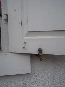 Eine mehrfache Funktion als Beschlag im Fensterbau haben sogenannte Vorreiber.[3] Diese werden sowohl innen als auch außen verwendet, um Fenster, Fensterflügel oder Fensterläden auf- bzw. festzuhalten.[4] Der Vorreiber als Fensterladenhalter ist dabei eine einfache, drehbare Metallfahne.[5]
