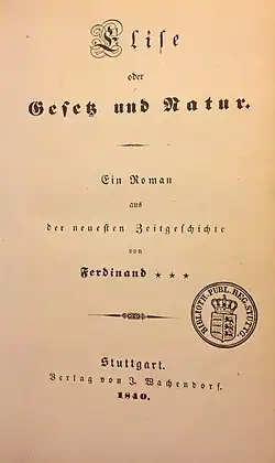 - Ferdinand ***[7][8]: Elise oder Gesetz und Natur. Ein Roman aus der neuesten Zeitgeschichte. Wachendorf, Stuttgart 1840.[9][10][11]