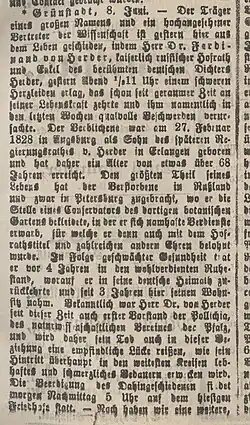 Deshalb ging Herder erneut in die Schweiz. Er studierte nun ab 1853 Botanik in Zürich, heiratete und wurde 1856 an den Botanischen Garten von Sankt Petersburg berufen. Ab 1860 arbeitete er hier als Konservator, von 1868 bis 1891 bekleidete er das Amt des Bibliothekars der dortigen renommierten Fachbibliothek[2]; er publizierte auch selbst botanische Fachliteratur. Carl Gustav Carus, der Präsident der Deutschen Akademie der Naturforscher "Leopoldina", promovierte ihn am 9. Juni 1863 zum Dr. phil., am 2. November 1864 nahm ihn die Akademie als ordentliches Mitglied auf.[3] Ferdinand Gottfried von Herder war in Fachkreisen sehr angesehen, avancierte zum „Kaiserlich Russischen Hofrat“, man verlieh ihm in- und ausländische Orden und viele Institutionen nahmen ihn als Ehrenmitglied in ihre Reihen auf, u. a. das „Freie Deutsche Hochstift“. In seinem ehemaligen Universitätsort Heidelberg ernannte ihn die Burschenschaft Frankonia 1886 ebenfalls zu ihrem Ehrenmitglied; der Vorgängerorganisation (Alte Heidelberger Burschenschaft Frankonia) hatte er bereits seit seinem Studium 1846 angehört.[4][5]