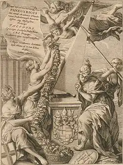 Fürstbischof Ferdinand II. empfängt die Thesen vom jungen Hendrick Daemen. Gemälde 1669 von Nicolaes Rosendael, Louvre, Paris