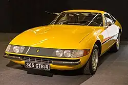Eine stilistische Besonderheit betrifft die Frontpartie. Die bis 1971 gefertigten Modelle haben ein umlaufendes vorderes Plexiglasband, das bündig in die Motorhaube übergeht und die beiden seitlich in die Kotflügel hineinragenden Blinker miteinander verbindet. Die vorderen Doppelscheinwerfer sind bei diesen Modellen feststehend hinter Plexiglasabdeckungen installiert. Als der 365 GTB/4 erschien, war das neu im europäischen Automobildesign.[4] Diese Gestaltung verstieß allerdings gegen die ab 1971 geltenden US-amerikanischen Sicherheitsbestimmungen, nach denen eine Abdeckung vor der Scheinwerferstreuscheibe nicht mehr zulässig war.[34] Auf der Suche nach einer Lösung experimentierte Ferrari 1970 unter anderem mit vier Rundscheinwerfern, die auf die Frontverkleidung aufgesetzt waren.[35] Da diese Konstruktion allerdings nicht mit den fließenden Linien der Frontpartie harmonierte, wurde sie nicht in die Serie übernommen. Stattdessen haben alle ab Herbst 1971 gebauten 365 GTB/4 Klappscheinwerfer mit einer in Wagenfarbe lackierten Abdeckung, die sich in geschlossenem Zustand ebenfalls fließend in die Frontmaske einfügen.[32][36] Aufgeklappt zeigen die Scheinwerfer auch bei hohen Geschwindigkeiten zwar keine Vibrationen, allerdings vergrößern sie den Luftwiderstand.[11] Anfängliche Überlegungen Ferraris, die Klappscheinwerfer auf den amerikanischen Markt zu beschränken, wurden im Hinblick auf eine einfachere Produktionslogistik nicht umgesetzt. Die auffällige Form der vorderen Blinker änderte sich über die Jahre nicht. Sie beeinflusste den British-Leyland-Designer David Bache bei der Gestaltung des Rover SD.[37][38] Zu den weiteren Besonderheiten der Karosserie gehören Scheibenwischer, die sich unter einer Wölbung der Motorhaube verbergen.[32]