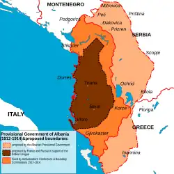 Auf der Konferenz in London setzte sich insbesondere Österreich-Ungarn für die Schaffung eines albanischen Staates ein, um zu verhindern, dass Serbien zu groß und mächtig wird oder sogar Zugang zur Adria erhält. Italien setzte sich auch für einen albanischen Staat ein, den man später als Brückenkopf für weitere Machtausdehnung im adriatischen Raum nutzen wollte. Die Gebietsansprüche der provisorischen Regierung Albaniens gingen weit über die heutigen Staatsgrenzen hinaus und umfassten weite Gebiete, in denen neben Albanern auch andere Völker in bedeutendem Maße vertreten waren. Frankreich und Russland, Verbündete von Serbien, wollten nur einen Rumpfstaat in Mittelalbanien von Vlora bis in die Mirdita ohne die Metropolen Shkodra und Korça zugestehen. Die Forderungen der Nachbarstaaten gingen noch weiter.[2][4][3]