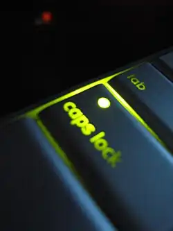 - Eine aktivierte Umschaltsperre (Shift Lock; ⇩) wirkt so, als wäre die Umschalttaste permanent gedrückt. Damit wird bei Druck auf eine Buchstabentaste der entsprechende Großbuchstabe ausgegeben und bei Betätigung einer Zifferntaste das zugehörige Sonderzeichen.
