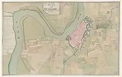 Plan de Dusseldorff – Der Festungsplan von 1795 zeigt den letzten Ausbaustand der Festung Düsseldorf. Außerhalb der Festung sind das Schloss Jägerhof und seine Gartenanlage („Jardin de la Venerie“) als Ursprung des Düsseldorfer Hofgartens zu sehen.