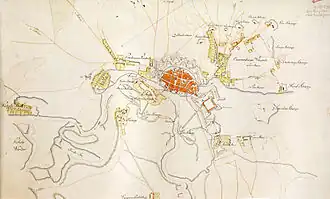 Die Besatzung hielt nicht nur die befestigte Stadt, sondern auch die vorgelagerten Dörfer,[Anm 3] um sich von dort mit Lebensmitteln und Viehfutter zu versorgen. Die heftigsten Kämpfe der folgenden Monate tobten um diese Vororte.