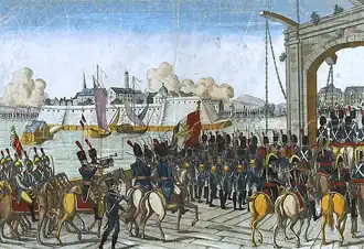 Russische Truppen erreichten nach dem Rückzug Napoleons aus Russland auf der Verfolgung der französischen Armee am 26. Dezember 1812jul. / 7. Januar 1813greg. Königsberg. Um der Bedrohung durch die französische Besatzung in der Festung Pillau zu begegnen, rückte der örtliche russische Kommandeur, Generalmajor von Sievers mit einigen tausend Mann[Anm 37] und einer Zahl Geschütze am 25. Januarjul. / 6. Februar 1813greg. heran und besetzte zunächst den Ort Alt-Pillau. Dann übersandte von Sievers an den französischen Kommandanten der Festung, General Pierre François Gilbert Castella, die Aufforderung abzuziehen und die Festung wieder vollständig an die preußische Krone zu übergeben. Erstaunlicherweise stimmte Castella bereits am nächsten Tag den Bedingungen zu und am 27. Januarjul. / 8. Februar 1813greg. zogen 1.200 französische Soldaten ab. Sie ließen 400 kranke Männer zurück. Die Festung wurde nicht von den Russen besetzt, sondern erhielt wieder eine rein preußische Besatzung.