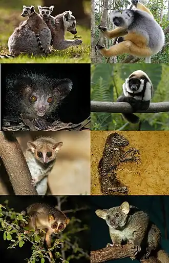 Im Uhrzeigersinn von oben links: Katta, Diademsifaka, Schwarzweißer Vari, Darwinius, Kleinohr-Riesengalago, Grauer Schlanklori, Grauer Mausmaki, Fingertier | ||||||||||||