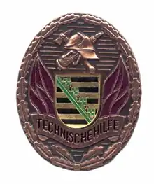 Das Feuerwehr-Leistungsabzeichen „Technische Hilfe“ ist 30 × 38 mm hochoval, massiv geprägt, umrandet mit Relief gestaltetem Eichenlaubkranz. Mittig ist das Wappen des Freistaates Sachsen (11 × 13 mm) eingesetzt. Das Wappen selber ist in den Landesfarben grün-schwarz mit Kunstemaille gehalten und goldfarbig gerahmt. Links und rechts des Wappens befinden sich unterbrochene durch das Wappen Flammenflügel in bordeauxviolett in der Farbe RAL 4004. Über dem Landeswappen ist das Feuerwehrsymbol dargestellt, bestehend aus einem Feuerwehrhelm mit Nackenleder vor einem gekreuzten Feuerwehrbeil und Strahlrohr. Darunter befindet sich der geschwungene Schriftzug: TECHNISCHE HILFE, welcher vertieft und schwarz ausgelegt ist. Auf der Rückseite ist eine Nadel mit Gegenhaken oder mit Kugelgelenk zur Befestigung aufgelegt.[3]