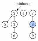 Irgendwann muss jedoch eine Reihenfolge in den Heap eingeführt werden, um die gewünschte Laufzeit zu erreichen. Insbesondere wird der Grad der Knoten (hier bedeutet Grad die Anzahl der Kinder) ziemlich niedrig gehalten: Jeder Knoten hat höchstens den Grad und die Größe eines Teilbaums, der in einem Knoten des Grades k verwurzelt ist, beträgt mindestens Fk+2, wobei Fk die k-te Fibonacci-Zahl ist. Dies wird durch die Regel erreicht, dass wir höchstens ein Kind von jedem Nicht-Wurzelknoten abschneiden können. Wenn ein zweites Kind abgeschnitten wird, muss der Knoten selbst von seinem übergeordneten Knoten abgeschnitten werden und wird zur Wurzel eines neuen Baums. Die Anzahl der Bäume wird in der Operation extractMin verringert, bei der Bäume miteinander verknüpft werden.