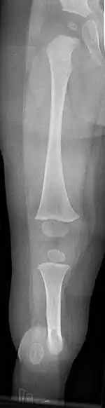Das Schienbein weicht in der Regel vorn-seitlich ab, besonders stark bei vollständigem Fehlen der Fibula. Am Knie ist oft der laterale Femurkondylus unterentwickelt und es besteht ein Genu valgum (X-Bein).[1][8] Oft fehlt auch das vordere Kreuzband.