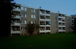 An der Nordseite der Fideliostraße steht ein Freizeitheim, ein Hügel dahinter, aufgeschüttet aus dem Aushub der Wohnbauten, dient zum Rodeln.