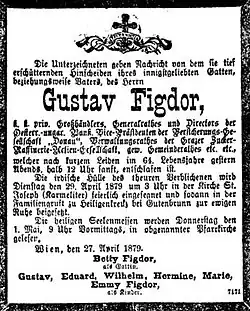 - Löwy Figdor (auch Löwi, Lewy, * 1811 in Preßburg, † 20. September 1893 in Wien) ⚭ Nanette Bettelheim (* ca. 1818, † 1892 in Wien), sechs Kinder, darunter: