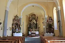 Der linke Seitenaltar aus dem dritten Viertel des 18. Jahrhunderts trägt eine Pietà, flankiert von den Heiligen Barbara und Magdalena. Der rechte Seitenaltar vom Anfang des 18. Jahrhunderts gibt im Mittelbild Franz Xaver und im Aufsatzbild Maria Immaculata wieder. Seitlich stehen die Statuen der heiligen Ulrich und Silvester. Die Konsolfiguren einer Muttergottes sowie der heiligen Florian und Nikolaus ergänzen die Ausstattung der Kirche.