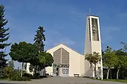 Die Kirche ist ein Betonbau mit Zeltcharakter und hat über einem trapezförmigen Grundriss ein mächtiges Satteldach. Die Fassade zeigt glatte Fronten. Die Hauptfassade dominiert mit einer wuchtigen Giebelmauer mit einer Betonglasfensterwand und einem Mosaik. Der seitlich vorgestellte Glockenturm hat eine asymmetrische Silhouette.