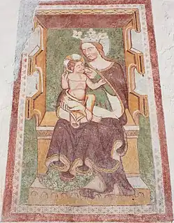 Die Kirche ist ein niedriger spätgotischer Bau, der im 17. Jahrhundert barockisiert wurde. Das nach Westen verlängerte Gotteshaus besitzt einen östlichen Dachreiter mit Spitzhelm. Nördlich am Chor ist eine Sakristei mit einem mit einem spitzbogig abgefasten Portal angebaut. Das Dach wurde 1992 mit Lärchenschindel neu eingedeckt. Bei der Außenrestaurierung 1995 wurde das frühbarocke Dekor des 17. Jahrhunderts mit Eckquadern, Fensterfaschen und Gesimsbändern wiederhergestellt und ein spätgotisches Fresko einer Maria lactans vom Anfang des 15. Jahrhunderts.