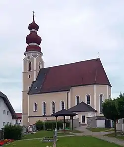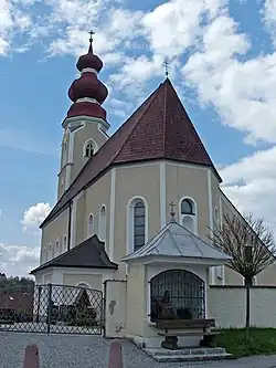 Die Kirche ist von einem Friedhof umgeben, der mit einer Mauer eingefasst wird, in ihm befinden sich zwei denkmalgeschützte Bildstöcke. In einem ist eine Pietà zu sehen, er steht gleich beim Friedhofseingang im Südosten, der andere ist westlich der Kirche wie eine Kapellennische in die Friedhofsmauer eingelassen und dient als Grabstätte Herzog.
