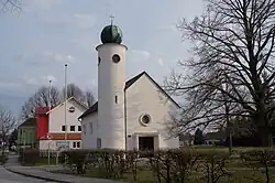 Die dreiachsige geostete Langhaus zeigt Rundfenster in Schräglaibung, herausragend ist der runde Kirchturm mit Zwiebelhelm an der Nordwestecke. Das rechteckige Langhaus hat innen eine Balkendecke und eine Westempore mit einer Holzbrüstung und einer Brüstungsorgel. Der eingezogene Chor hat ein Tonnengewölbe, im Süden ist die Sakristei angebaut. Ein Westfenster zeigt die figurale Glasmalerei hl. Josef mit Jesuskind (1937).