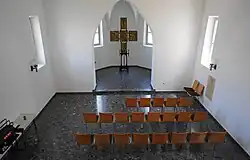 Das Kircheninnere zeigt ein Langhaus unter einer Flachdecke.