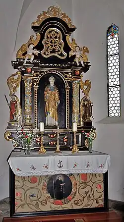 Am Knorpelwerkaltar von 1654 steht die Figur des heiligen Leonhard, seitlich ein um 1440 gefertigter, spätgotischer heiliger Leonhard und ein barocker, heiliger Antonius Eremita aus dem 18. Jahrhundert. Im Aufsatz ist ein vergoldetes, verschlungenes Marien- und Jesusmonogramm zu sehen. Das Antependium zeigt ein blütengerahmtes Tondo des hl. Leonhard umgeben von Blumenranken.