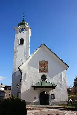 Bei der Kirche handelt es sich um einen gotischen Bau des 14. Jahrhunderts, der im Barock und Anfang des 19. Jahrhunderts Veränderungen erfuhr. Das Langhaus wird durch dreifach gestufte, der eingezogene Chor durch zweifach gestufte Strebepfeiler gestützt. Der Turm an der Nordostseite des Langhauses mit Mauerschlitzen, rundbogigen Schallfenstern und einem barocken Zwiebelhelm wurde 1833 erhöht. Eine Glocke goss 1540 Hieronymus Egker. Im Winkel zwischen Turm und Chor steht die Sakristei. Die Architekturpolychromie der Biedermeierzeit wurde 1994 wieder hergestellt. Der Turm und das Langhaus weisen Ortsteinverzierungen auf. Über dem Westportal befinden sich ein Rundfenster und ein Wandgemälde des heiligen Michael aus dem 18. Jahrhundert. Im Chorschluss ist eine römerzeitliche Grabinschrift für Aurelius Sura, seine Gattin Aurelia Tricconia und seinen Sohn Aurelius Ursus eingemauert.